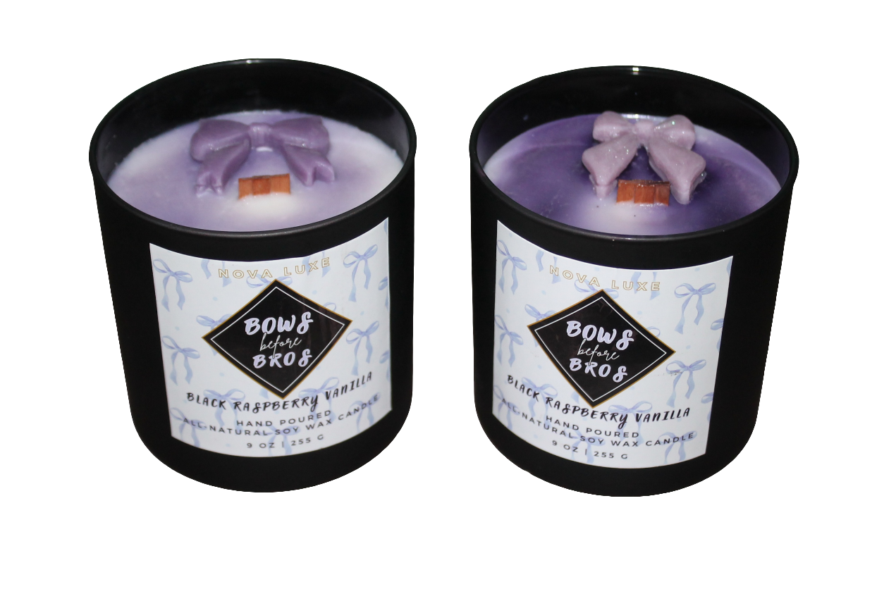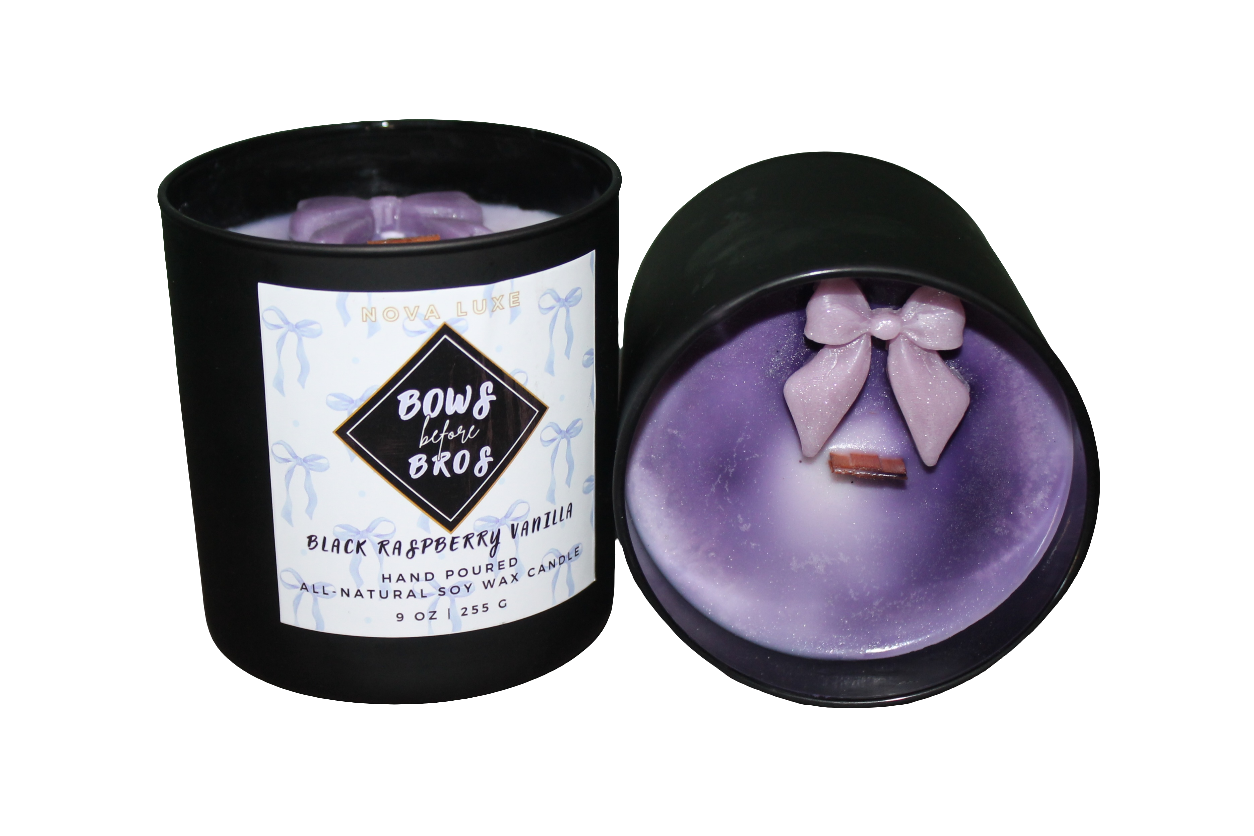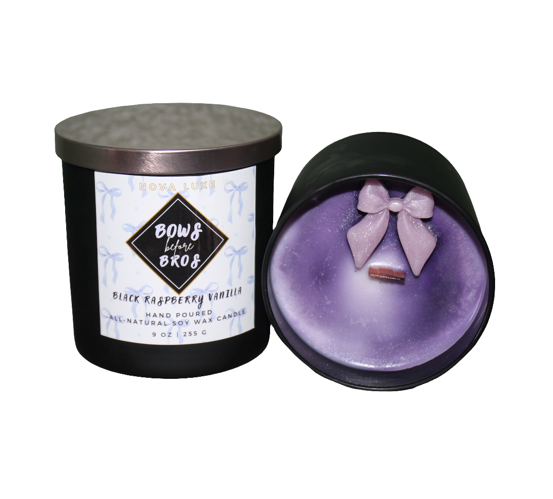 "Bows Before Bros" features the titillating scent of black raspberry vanilla! It's a sweet mix of bergamot, pear, plum wine, vanilla, orchid, cashmere, and musk. This candle features a stunning and vibrant hand-marbled design with a cute bow embed, finished with a dusting of eco glitter.